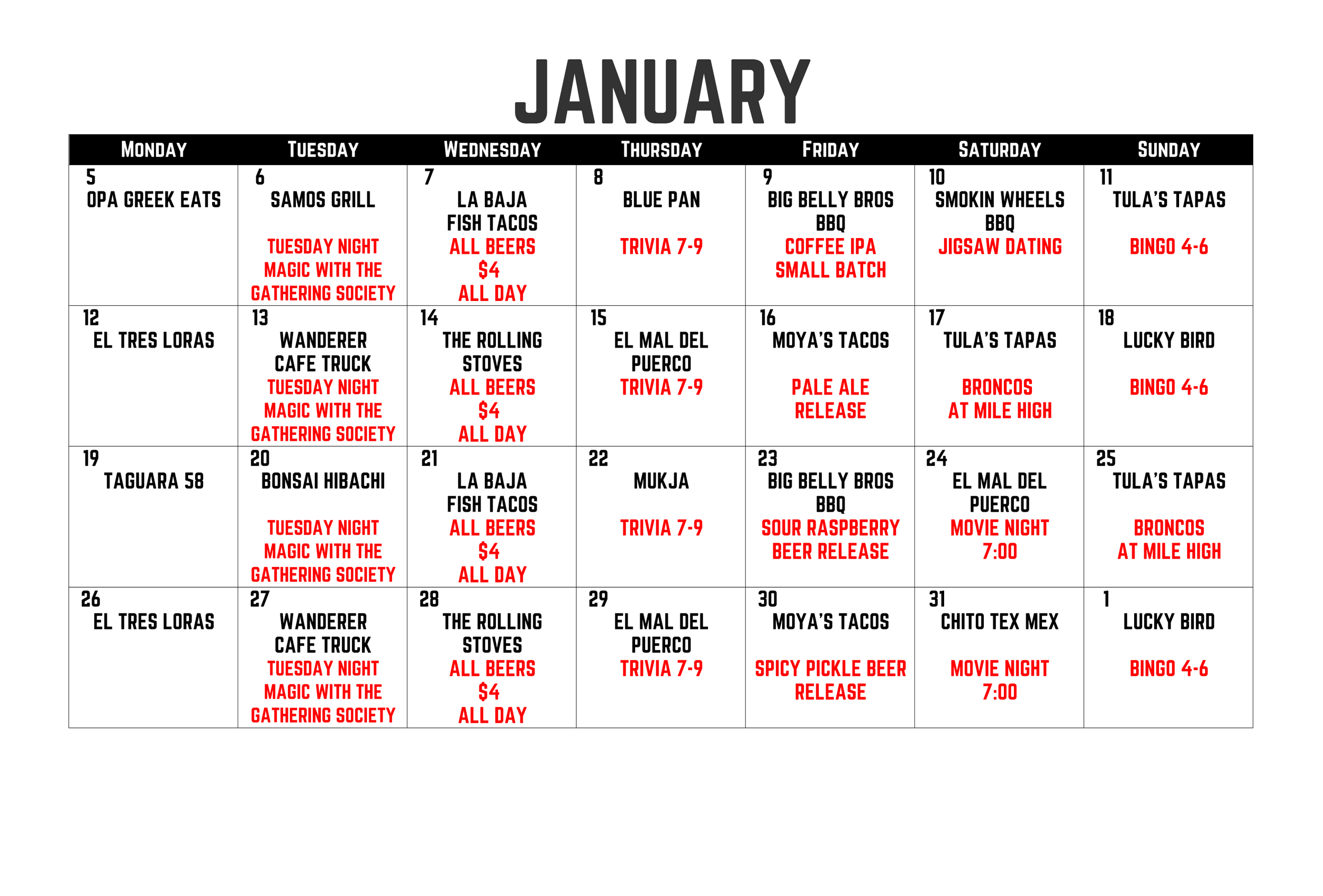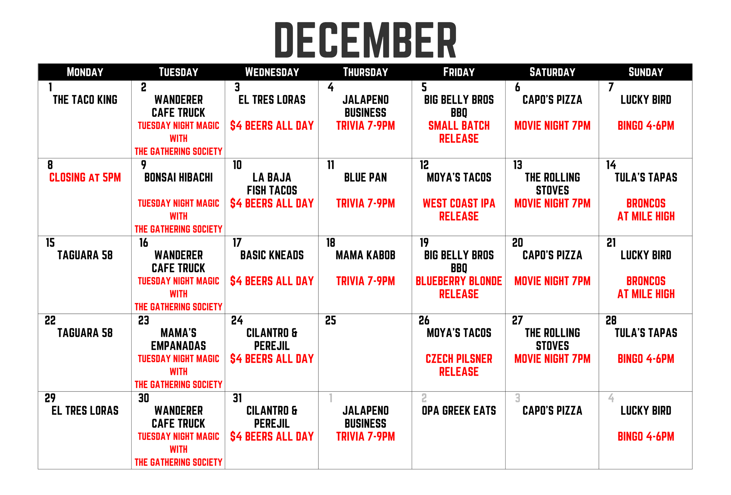 ALSO - OUTSIDE FOOD IS WELCOME. FEEL FREE TO GRAB TAKEOUT ON THE WAY IN, ORDER DELIVERY FROM OUR NEIGHBORS OR PLOP YOUR CROCKPOT RIGHT ON THE BAR.
